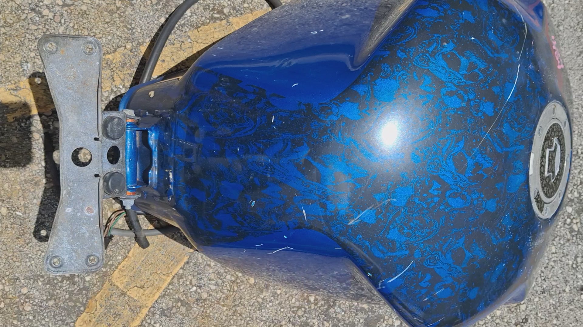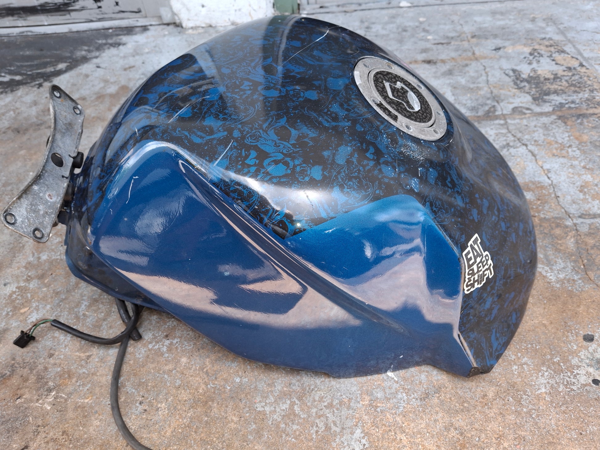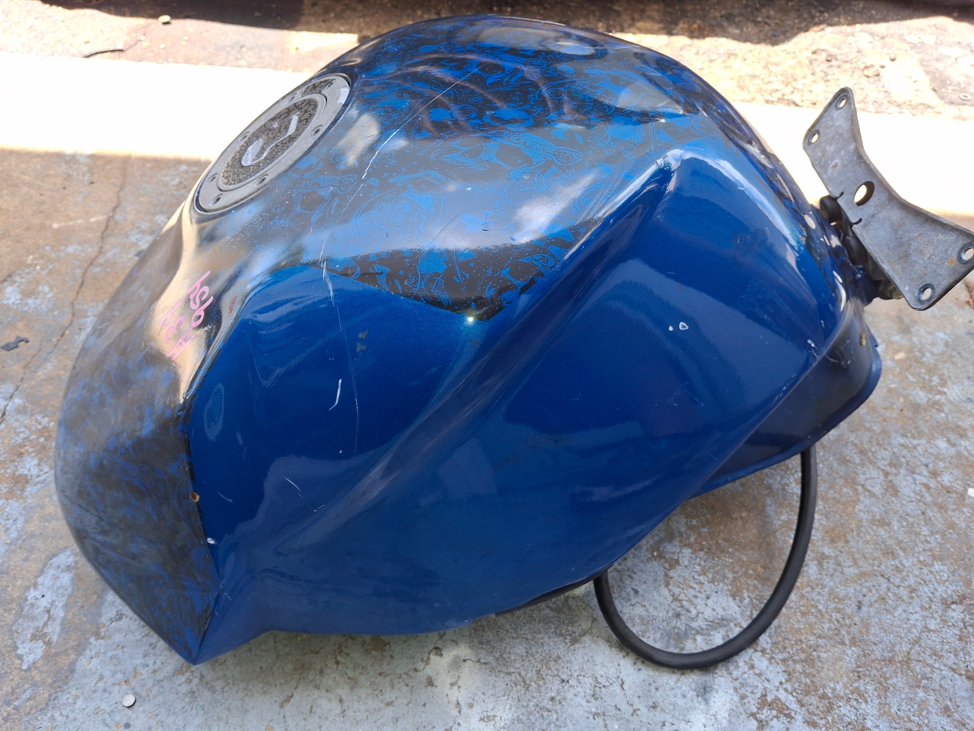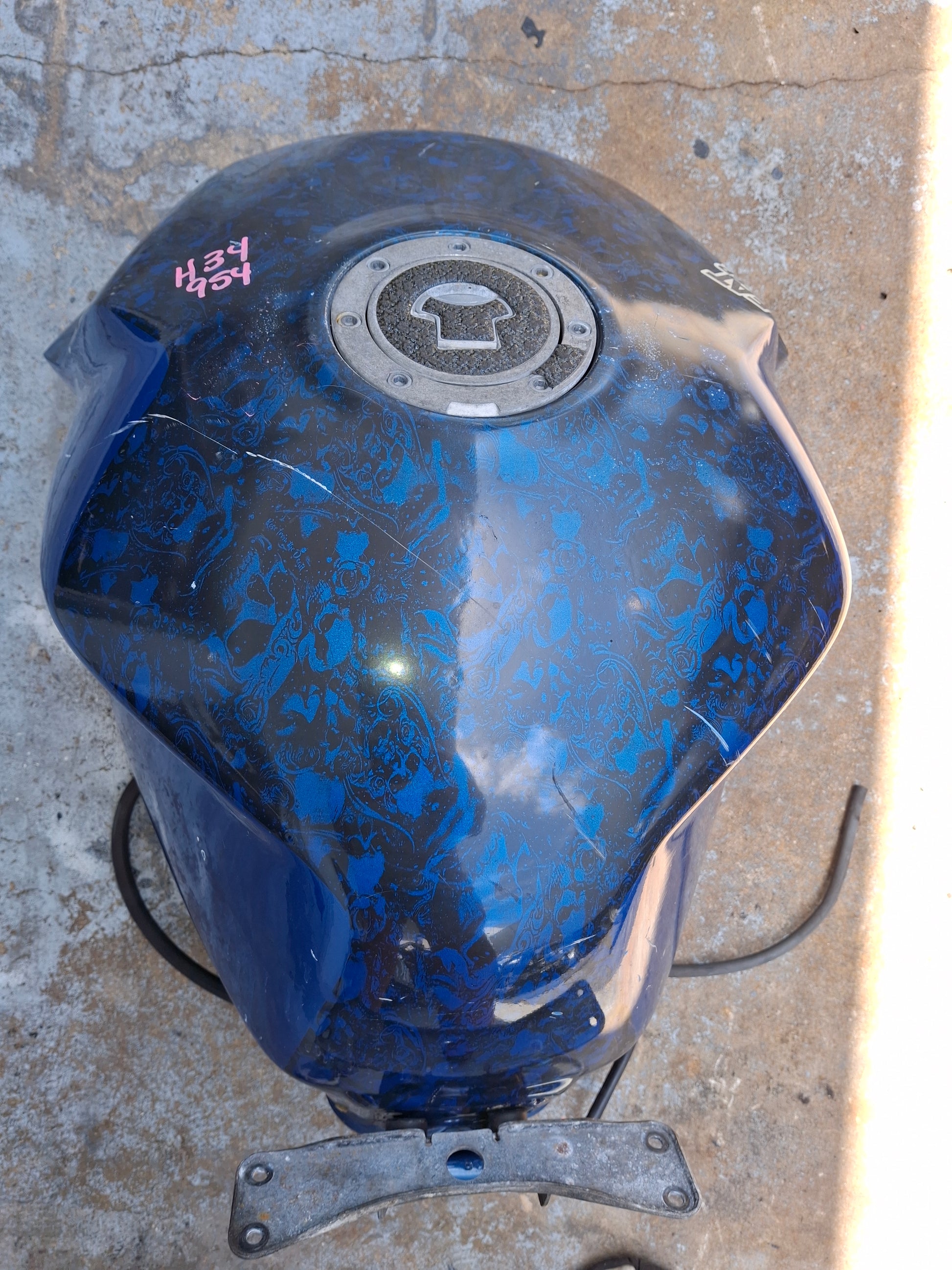 This listing is for the gas tank off of a Honda CBR 954 (fuel pump not included) . It has been customized , as you can see in the pictures the sides are kind of flared out. It has a custom paint job and we do have the matching tail and front fender available, there were no side fairings. There are some scratches on the tank due to normal wear and tear. Some of the pain is chipped, and you can see one of the flares on the side of the tank is broken at the tip. There will be other signs of wear as well. Please look closely at all pictures and the video for the best description of the tank. This listing is for the gas tank only the fuel pump is sold separately. If you are interested in adding the fuel pump to this order please let us know. Please look at all pictures and ask all questions prior to purchase.