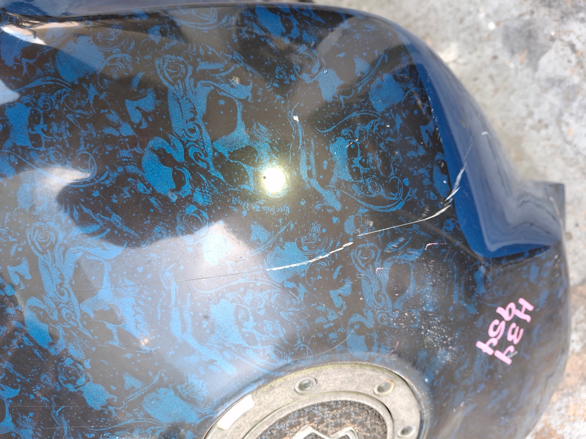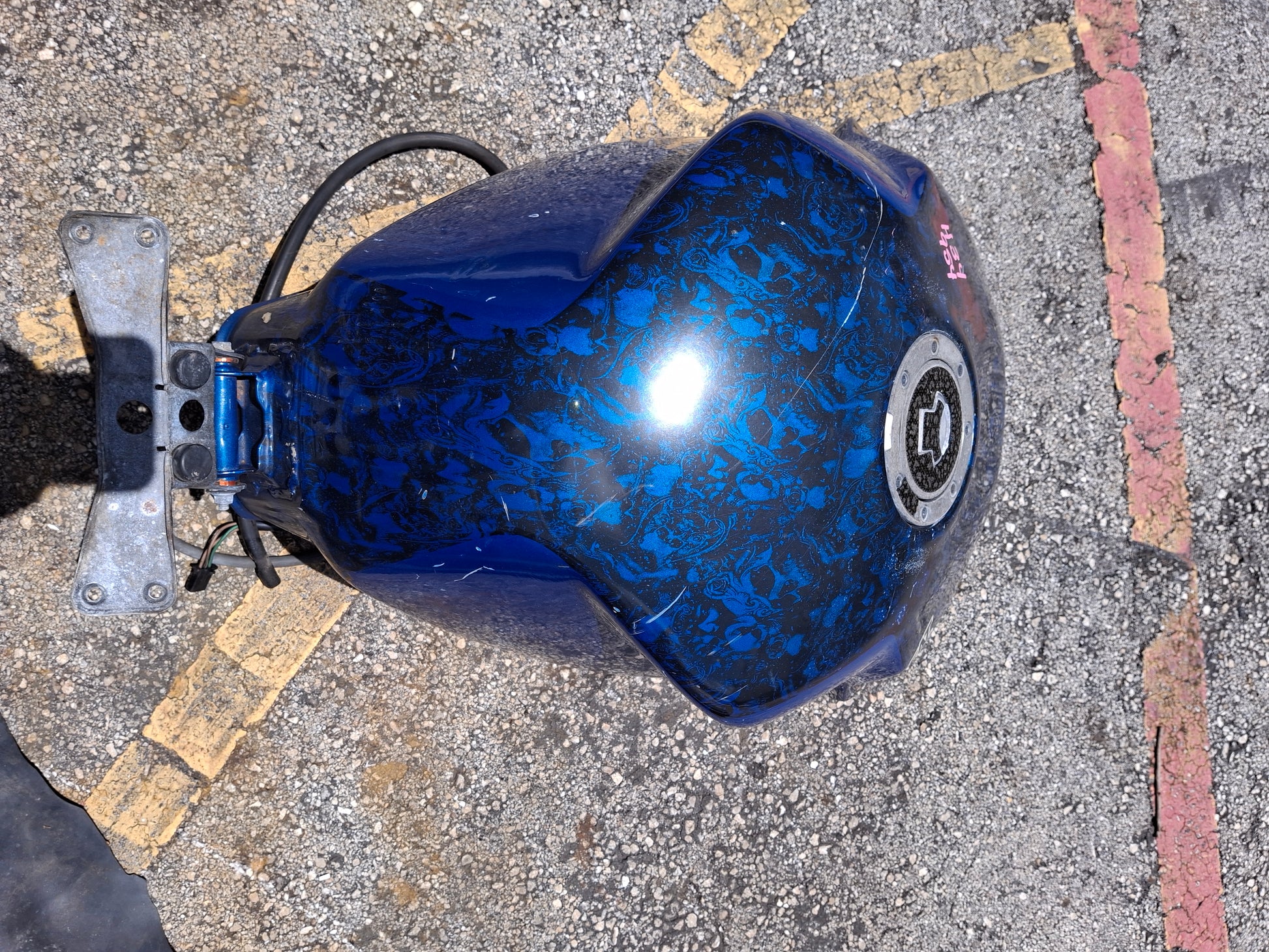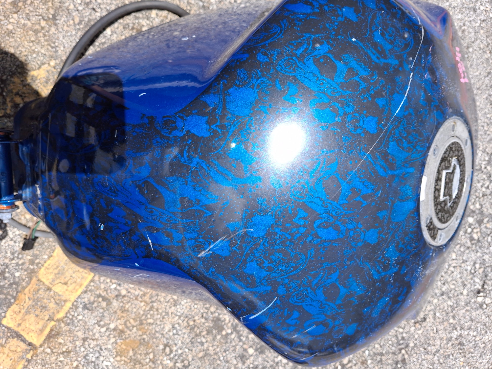 This listing is for the gas tank off of a Honda CBR 954 (fuel pump not included) . It has been customized , as you can see in the pictures the sides are kind of flared out. It has a custom paint job and we do have the matching tail and front fender available, there were no side fairings. There are some scratches on the tank due to normal wear and tear. Some of the pain is chipped, and you can see one of the flares on the side of the tank is broken at the tip. There will be other signs of wear as well. Please look closely at all pictures and the video for the best description of the tank. This listing is for the gas tank only the fuel pump is sold separately. If you are interested in adding the fuel pump to this order please let us know. Please look at all pictures and ask all questions prior to purchase.
