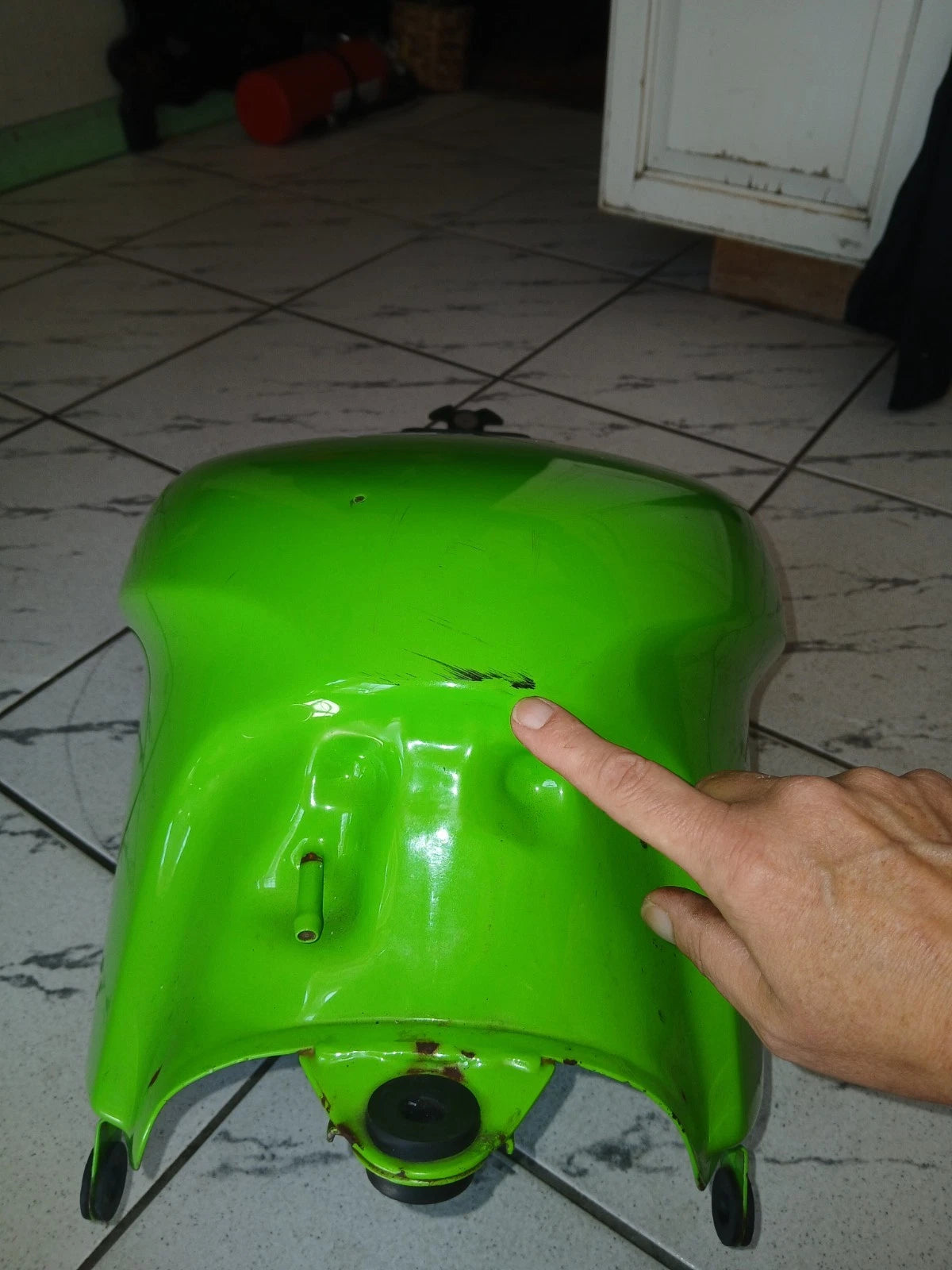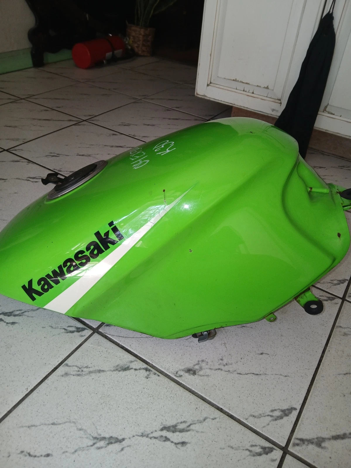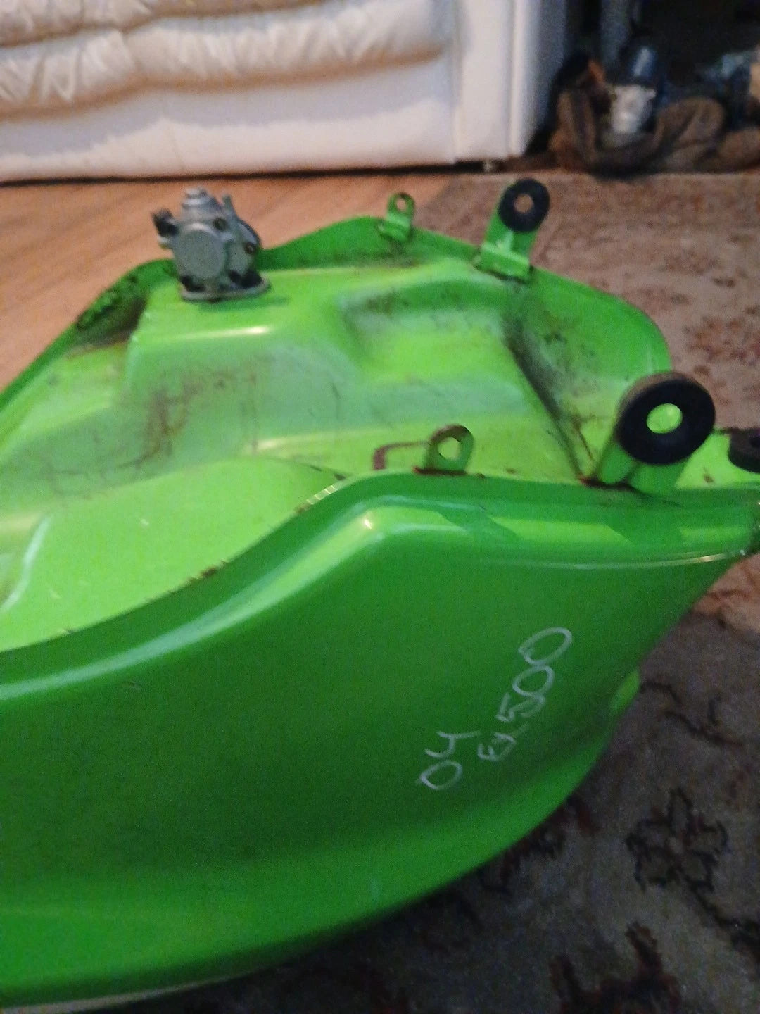 This is a used OEM 04 Kawasaki Ninja EX 500 Tank. Please look closely at pics. Inside of the tank looks nice as shown in pics. Has gas cap, but no key. Has some scratches from wear and tear. There is some rust under the tank. Has petcock. 2 of the 6 tabs on bottom of Tank are broken off as shown in pics. Still the nicest EX500 Tank we've ever had. Please look closely at pics.