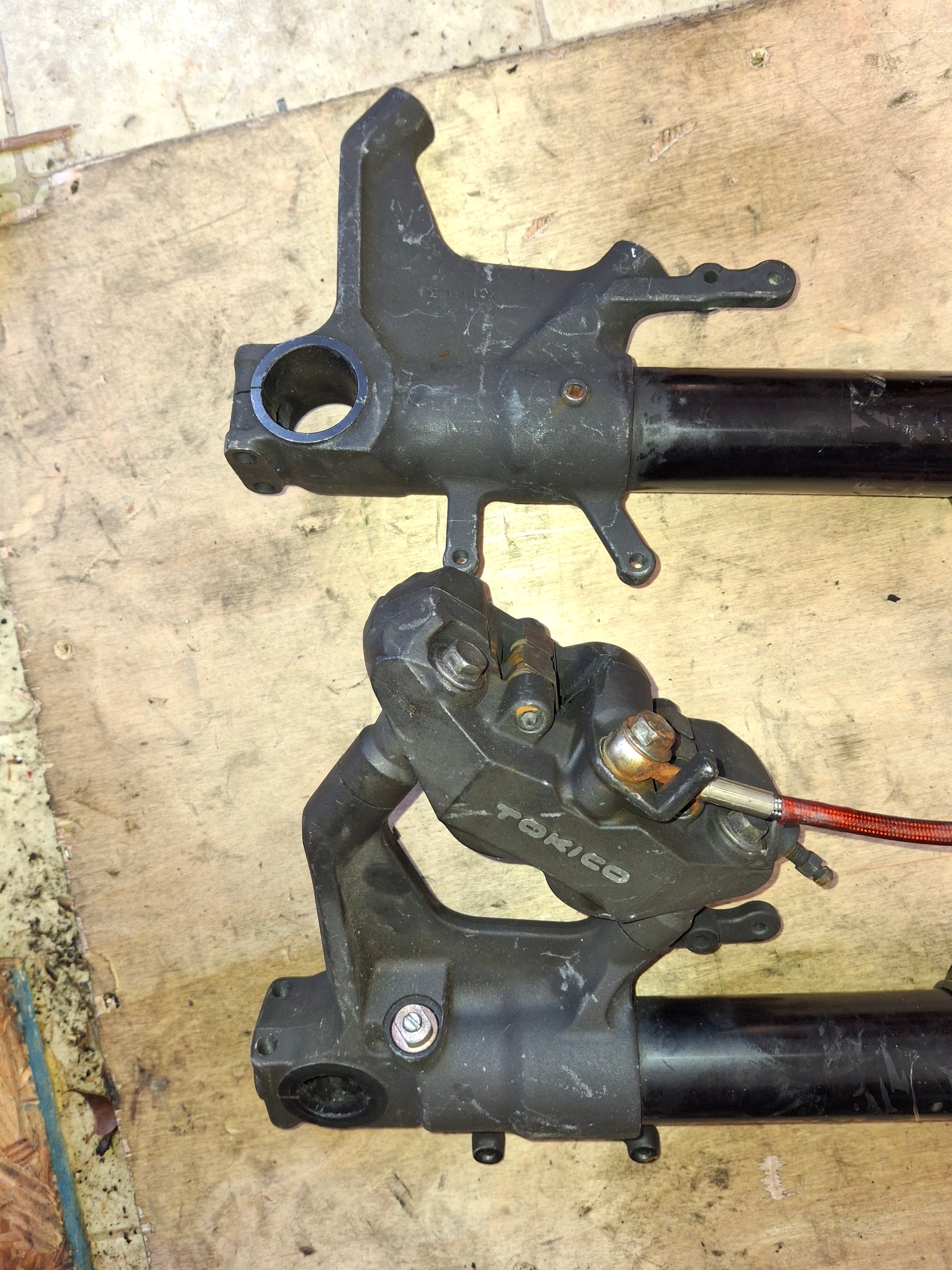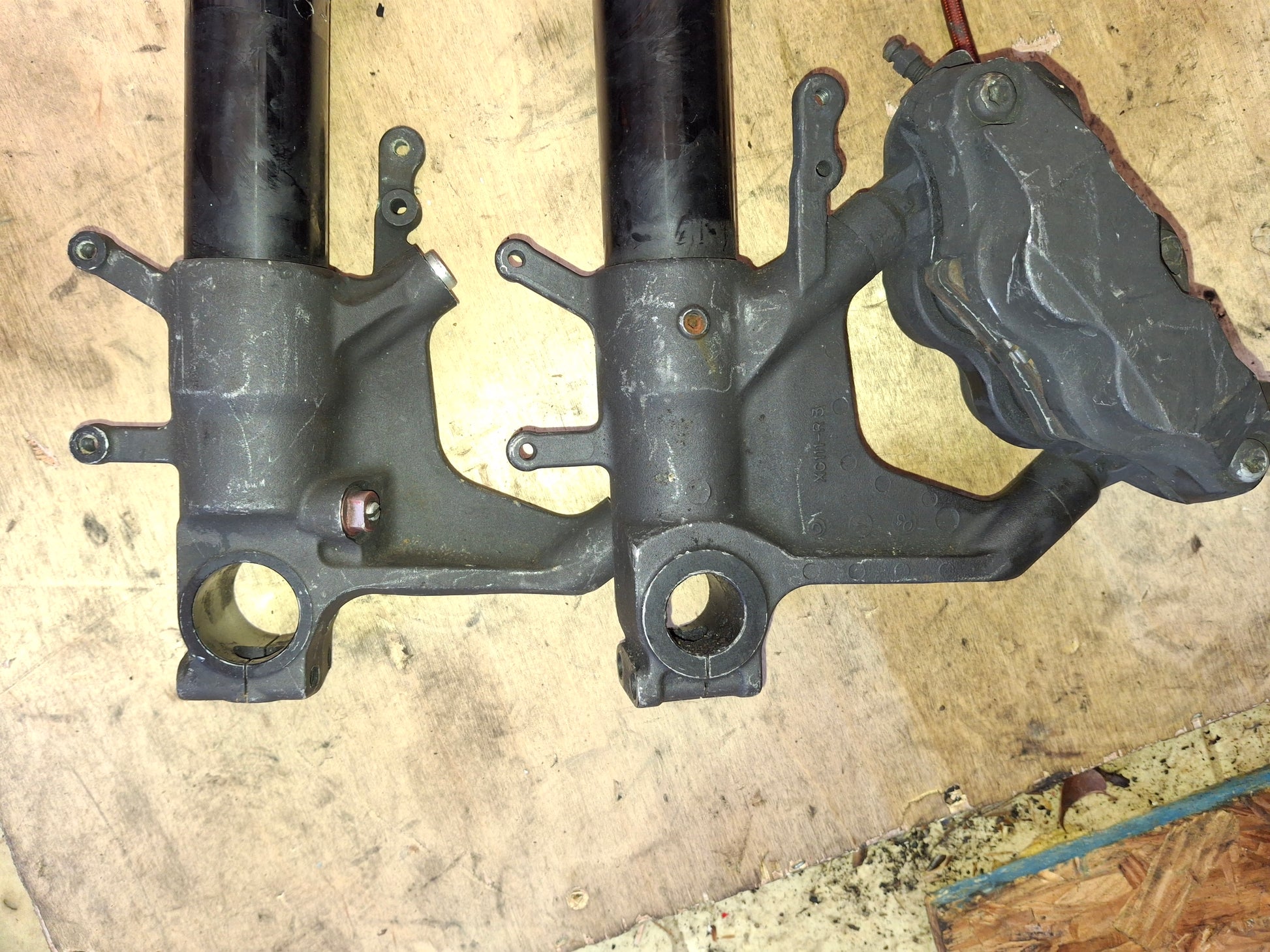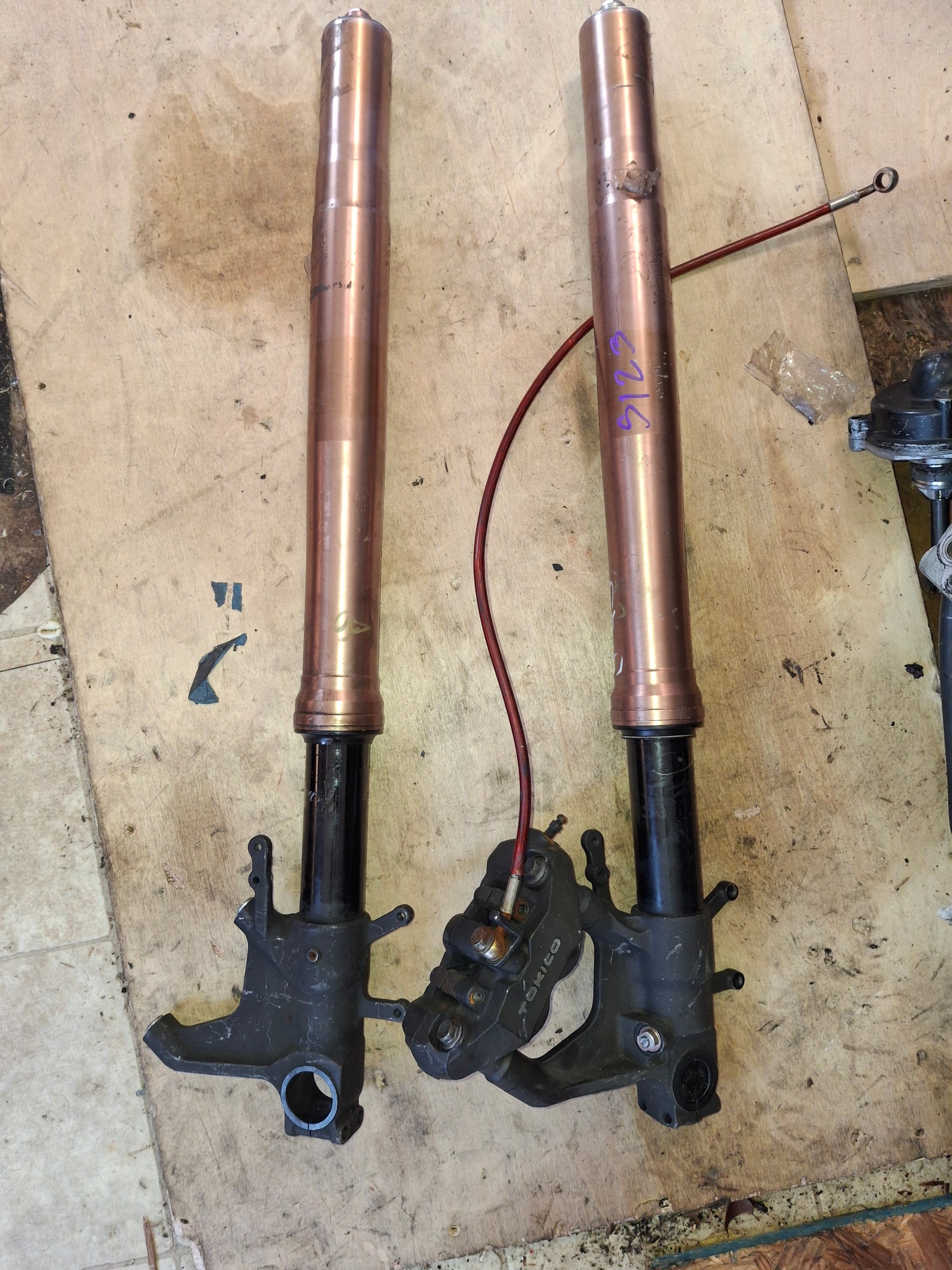 This listing is for the front forks and 1 caliper off of an 05-06 Suzuki GSXR 1000. These forks are in used condition. They do show signs of normal wear and tear and will need cleaning. We will clean them a little prior to shipping/ There will be scratches and other normal signs of wear on the items. The top of one of the forks does have some damage, we included a picture. The numbers on the foot of the forks are XC-111 R3 and XC-111 L3. The caliper and line shown in the pictures will be included. What you see is what you get. Seals do not seem to be leaking and look ok. We do not guarantee them to be good. Please look closely at all pictures and ask all questions prior to purchase. We do have a rolling chassis of this available as well as some other parts. if you do not see what you need listed please message us.
