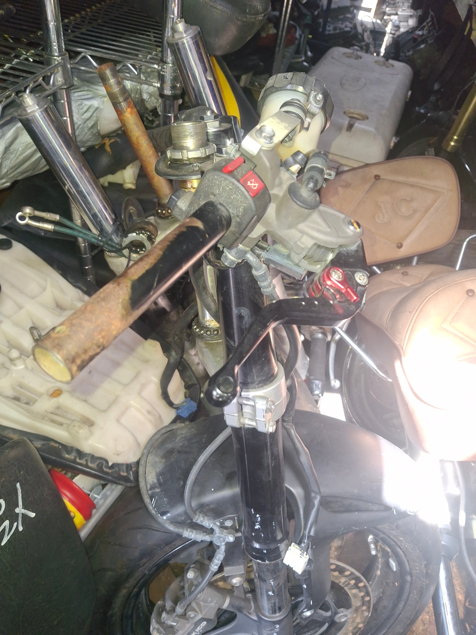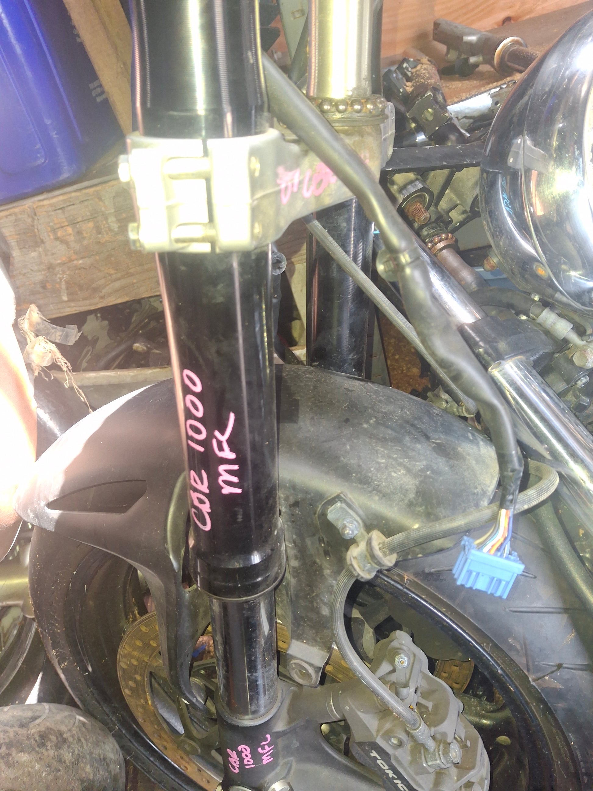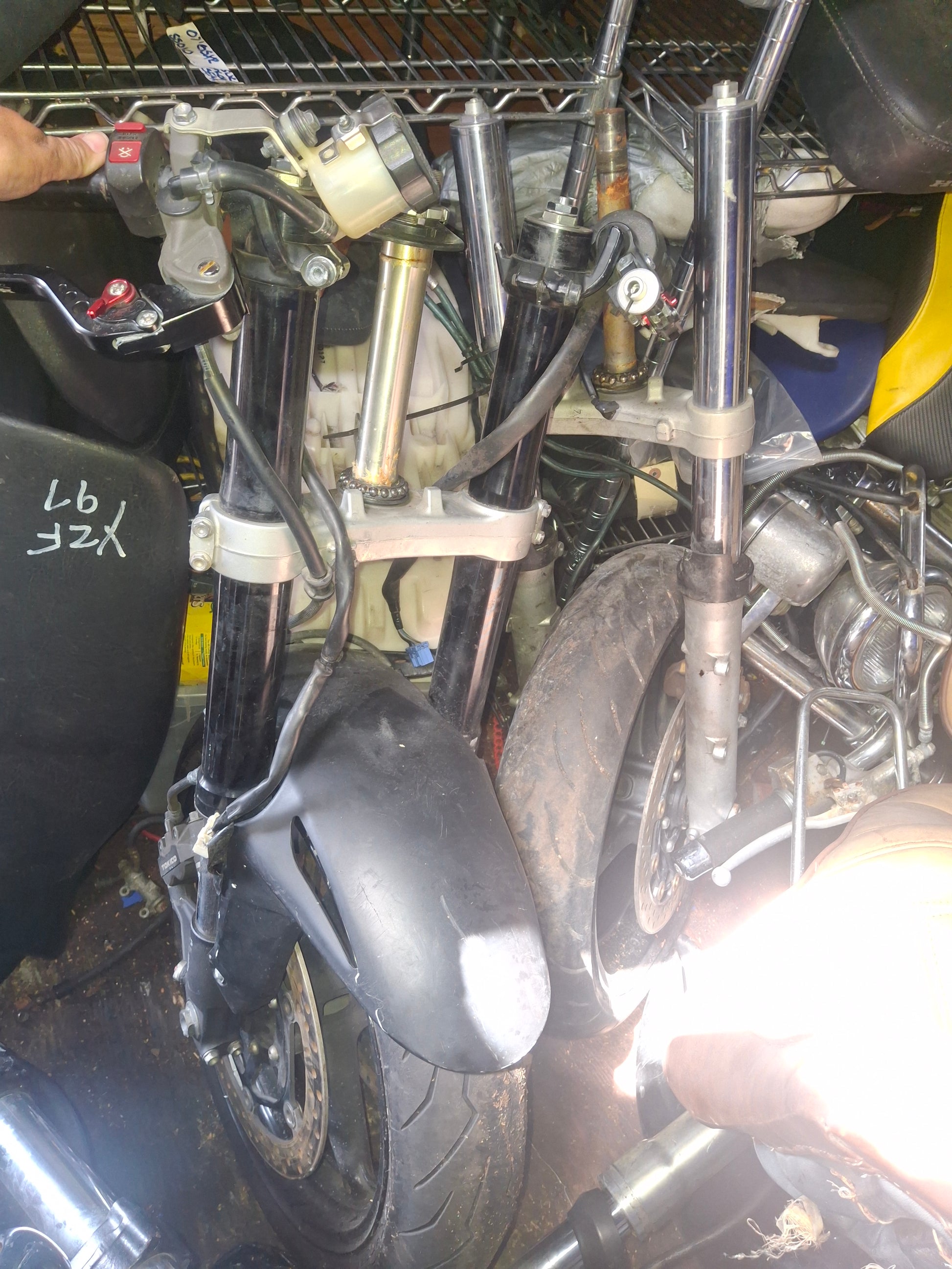 You will receive what you see in the pictures, front forks, lower triple tree (we may have an upper tree in stock, if you need it message us and we will check), handle bars (right side has no grip), both side switches, levers, front fender, from rim, rotors , calipers are included.