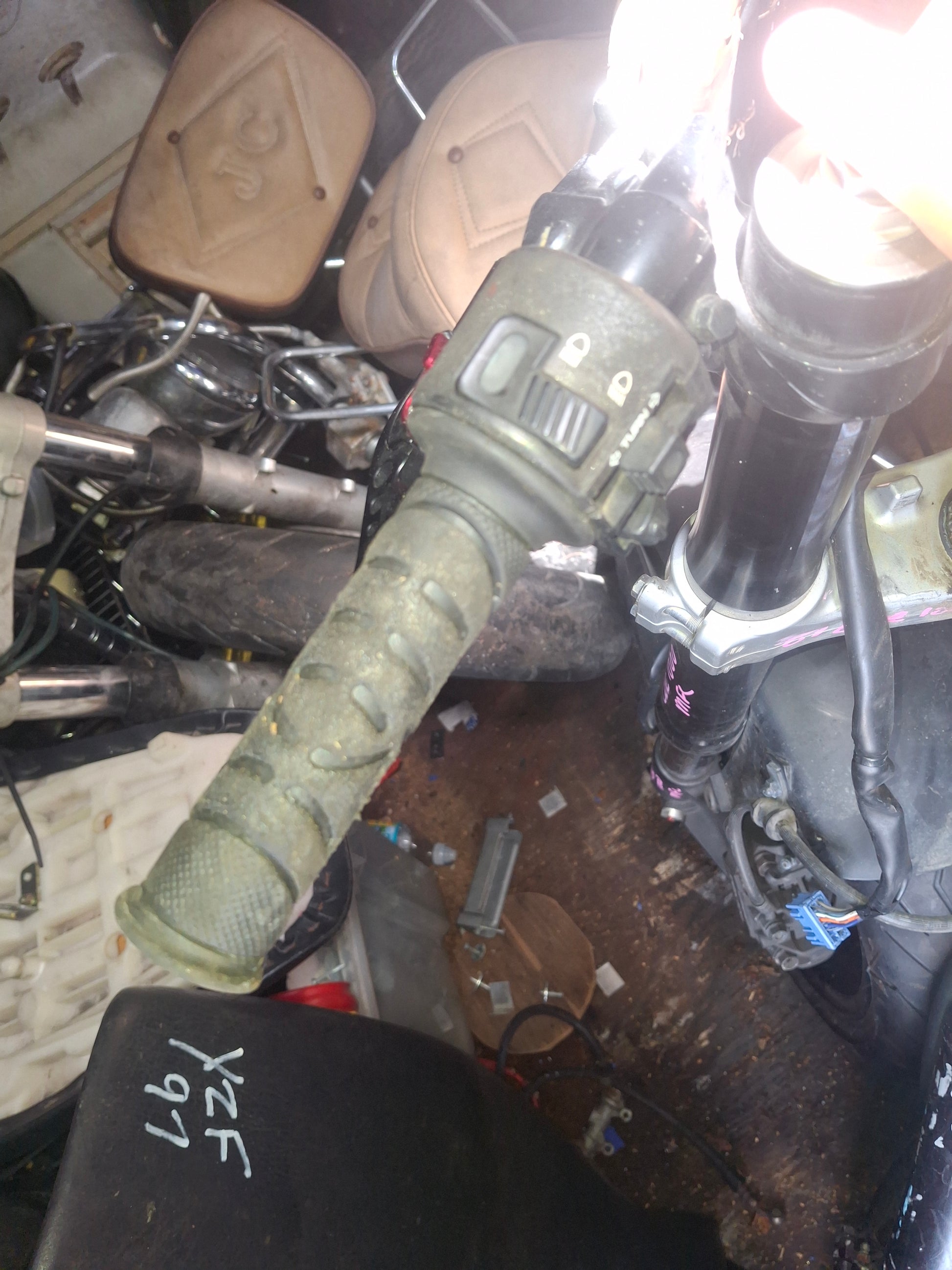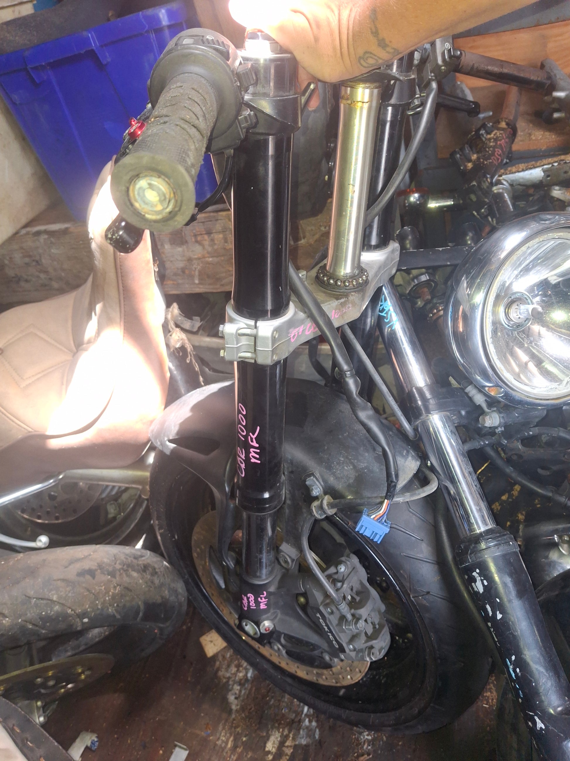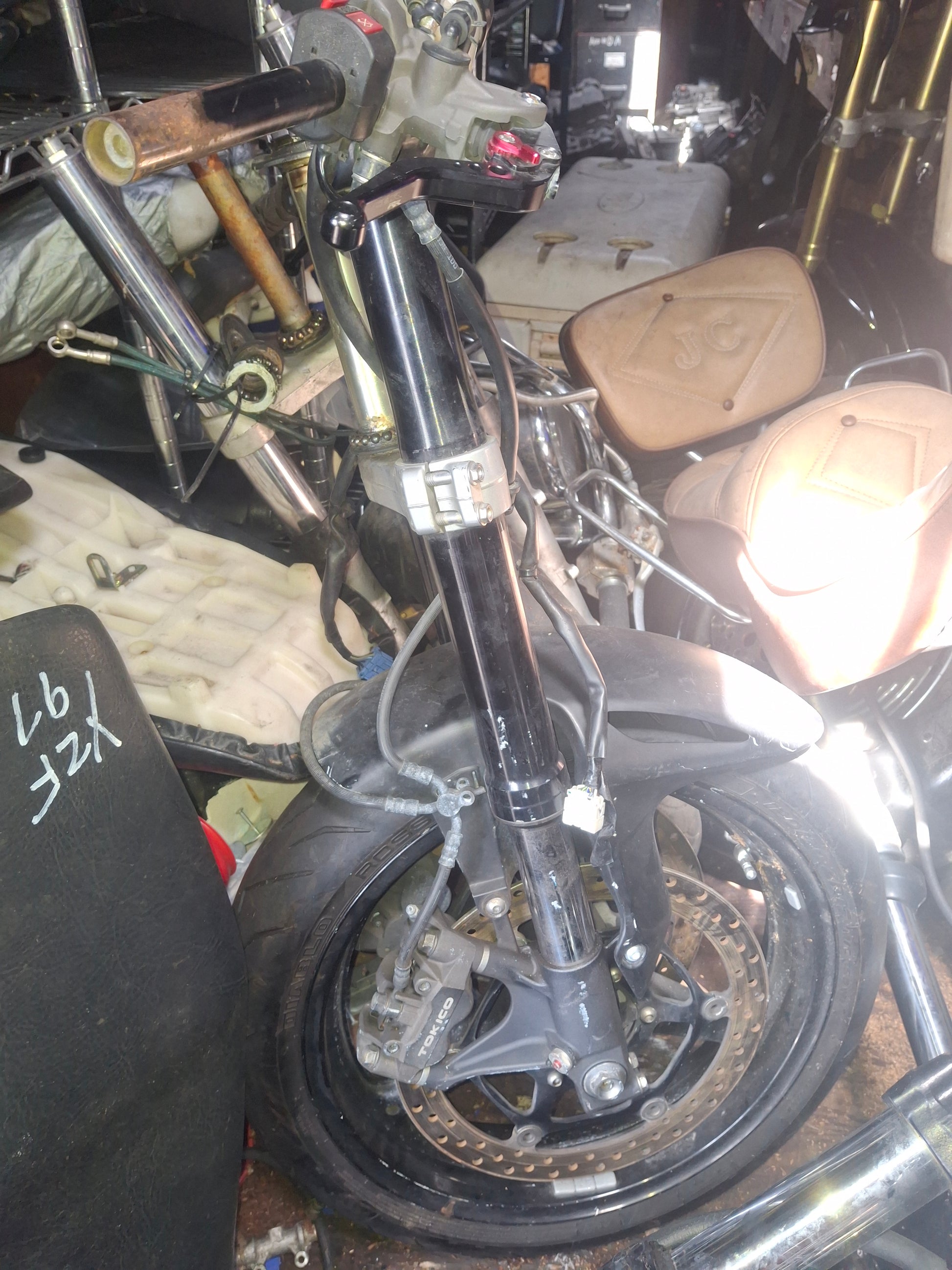 You will receive what you see in the pictures, front forks, lower triple tree (we may have an upper tree in stock, if you need it message us and we will check), handle bars (right side has no grip), both side switches, levers, front fender, from rim, rotors , calipers are included.
