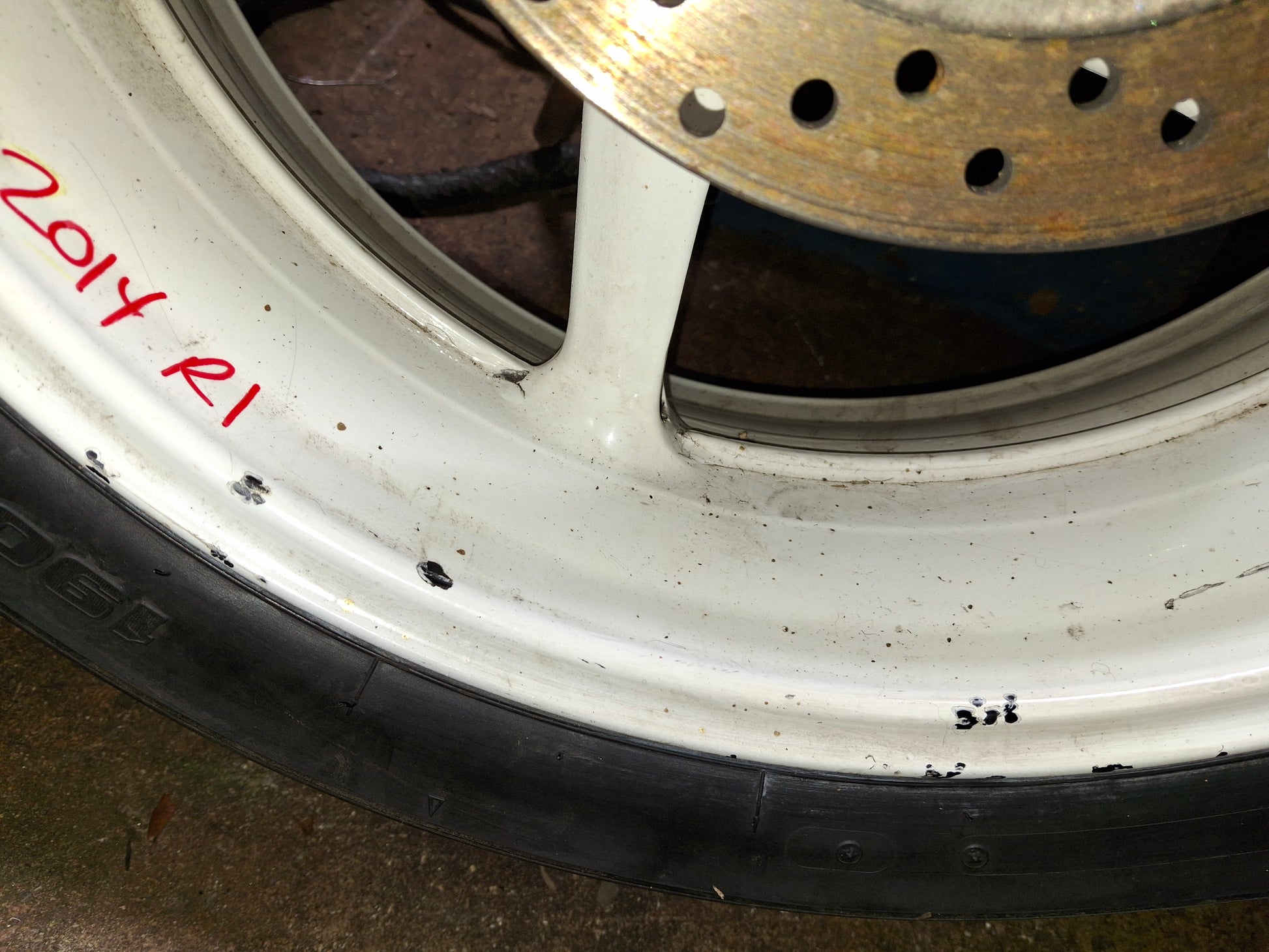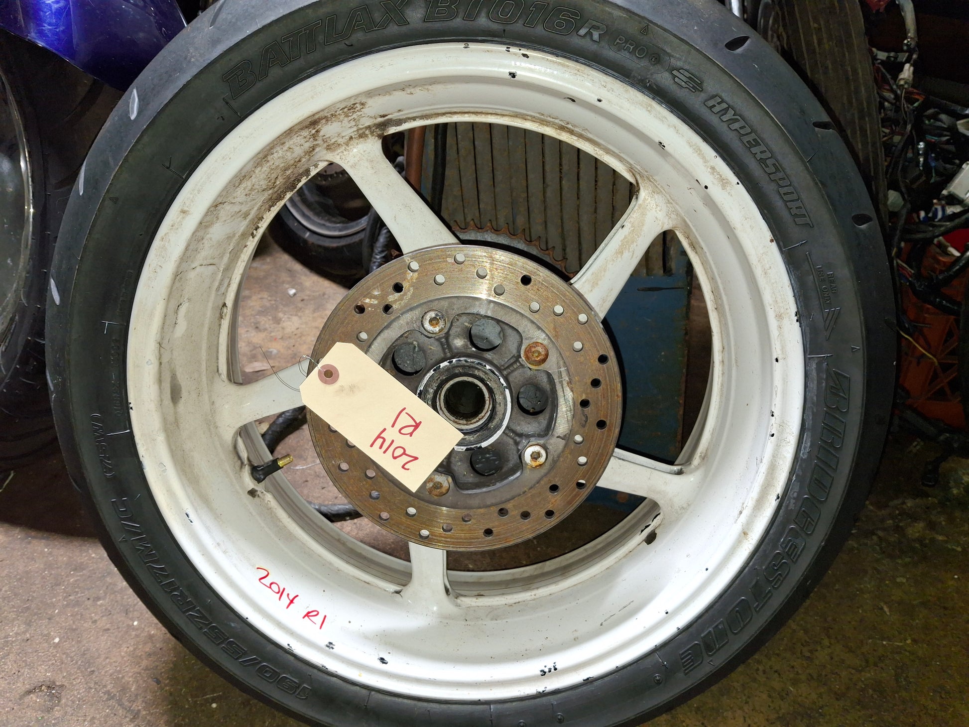 This listing is for the rear rim off of an 09-14 Yamaha R1. The rotor and vortex sprocket shown in the picture are included. We will send it with the tire but it is used and we do not guarantee the tire to be good. The rim spins straight. It is 17X6. As you can see from the pictures this rim is used. There are areas where the paint is chipping away. There are scratches on the item. It is in good used condition. It could use a good cleaning as well. We do have the matching front rim in stock as well. Please look closely at all pictures and ask all questions prior to shipping.