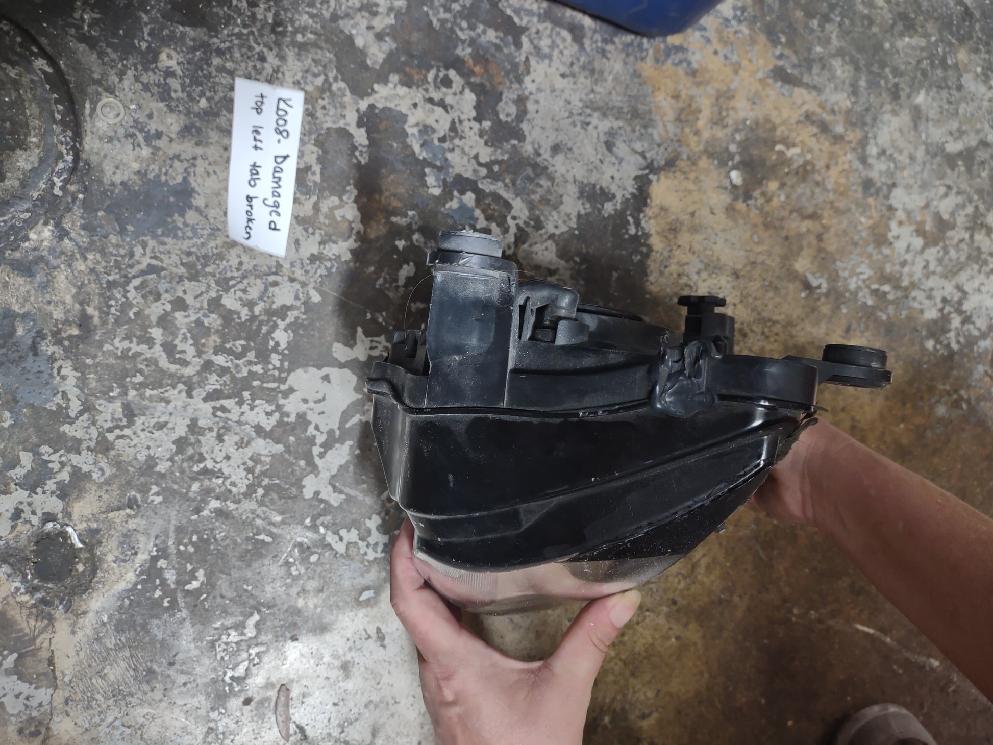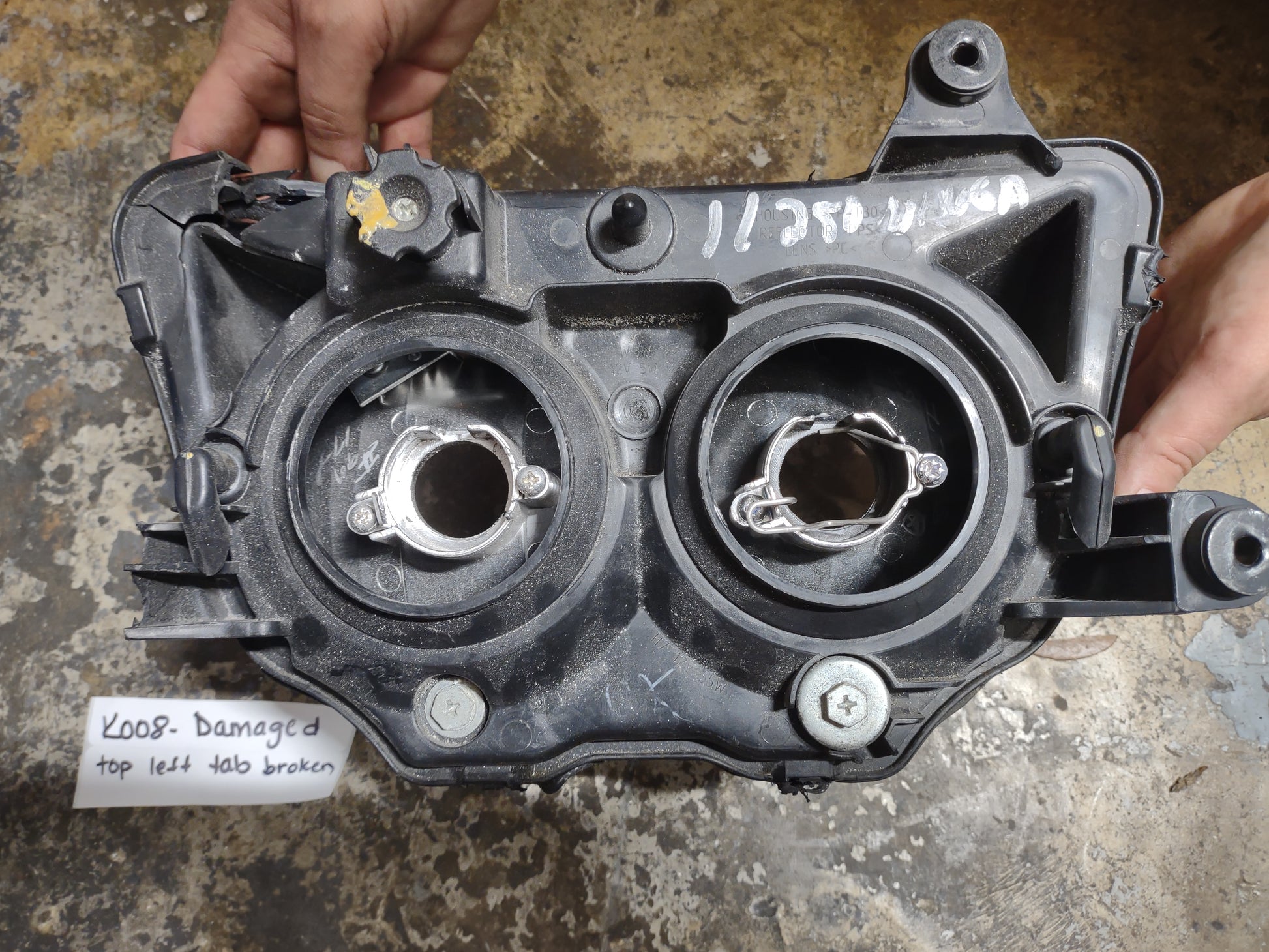 This headlight will fit 2008 - 2012 Kawasaki EX250 / Ninja 250. This item is damaged. The 2 left side tabs are broken off. The plastic around where the top tab would be is broken and cracker, please see pictures. It does appear that some of the plastic is chipped away on the underside of the headlight as well. There does appear to be a spot that a repair was attempted as well. This headlight is used and will show scrapes, scratches and other signs of normal wear and tear. Please look closely at all pictures provided as they will give the best description. Please message us if you have any questions.