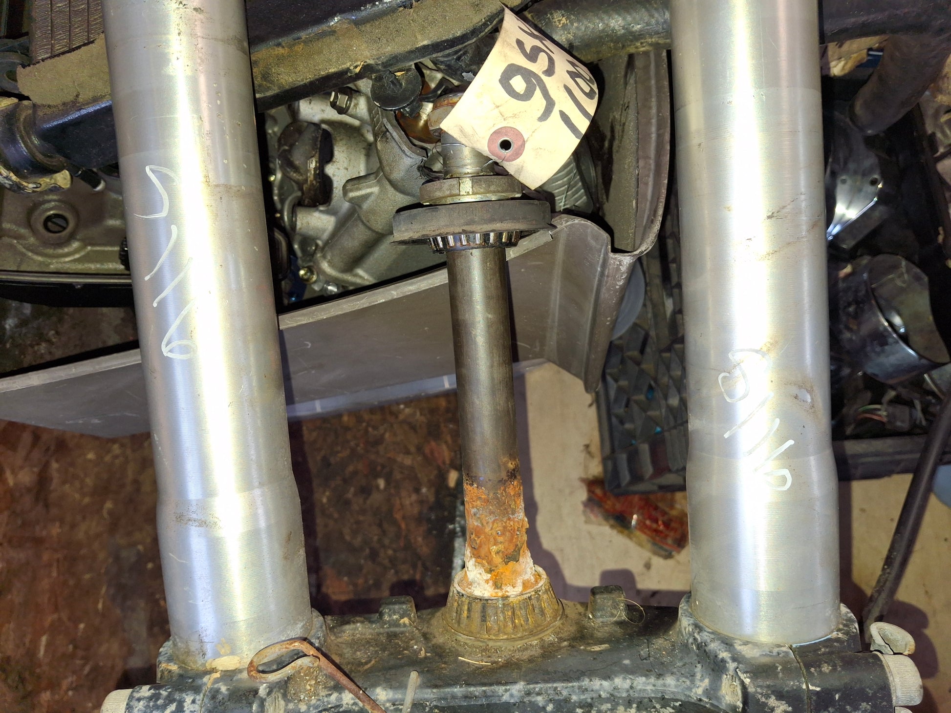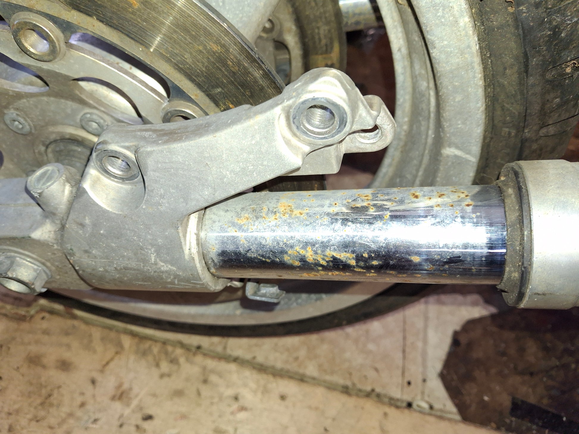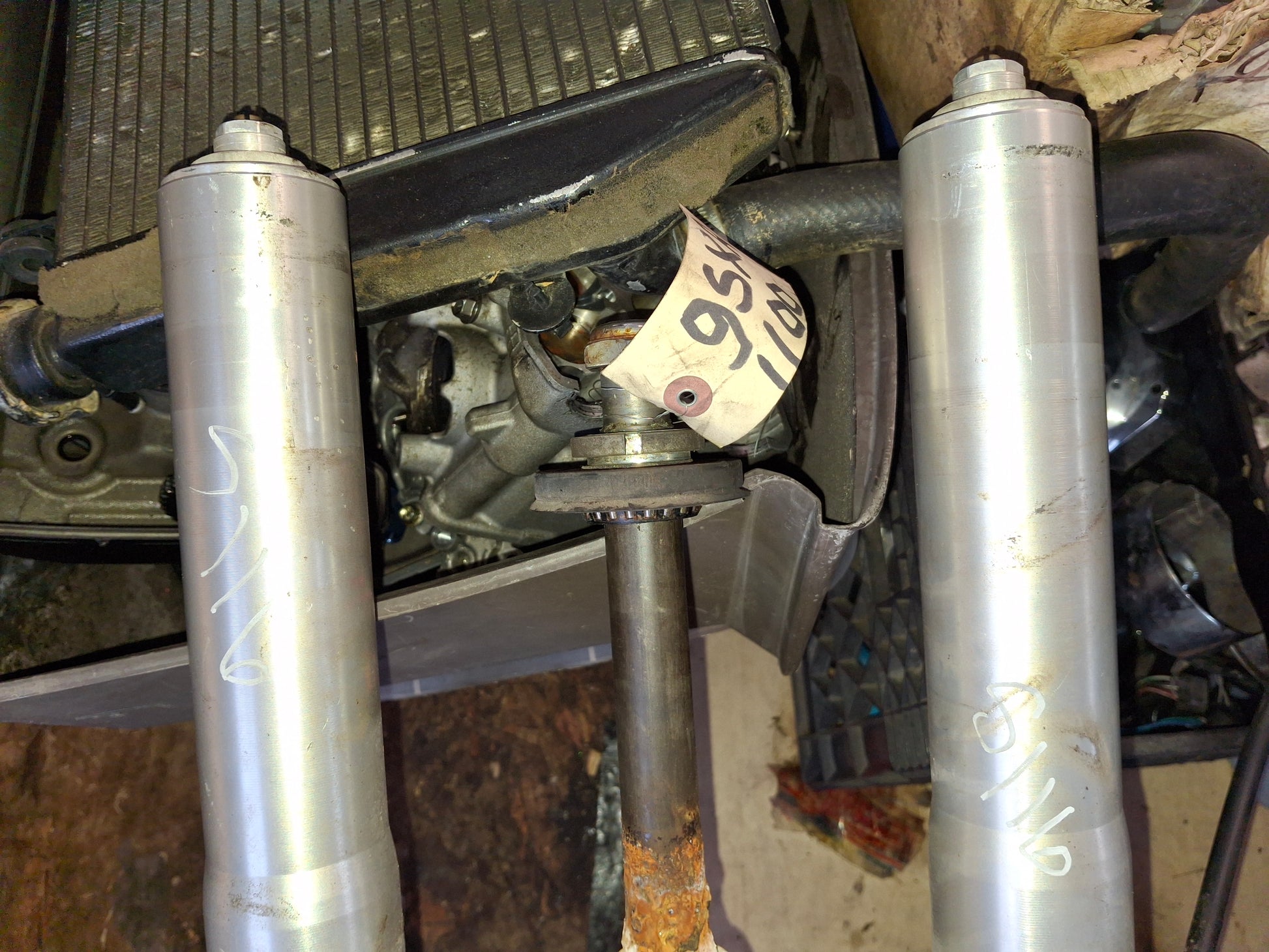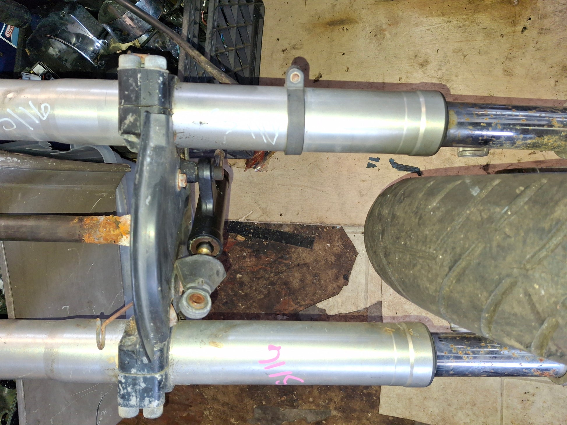 This listing is for the front forks, lower triple tree, front rim , rotos and steering damper off of a 93-98 Suzuki GSXR 1100. The front end is in good, straight, working condition. The tire on the rim is no good. There is some pitting on the lower legs of the forks, please see pictures. It looks like the numbers on the feet are 8(3?)592, but it is a little hard to see with the wheel in the way. Please look closely at all pictures and ask all questions prior to purchase. We do not guarantee fork seals to be good. This item is used so will not be perfect.